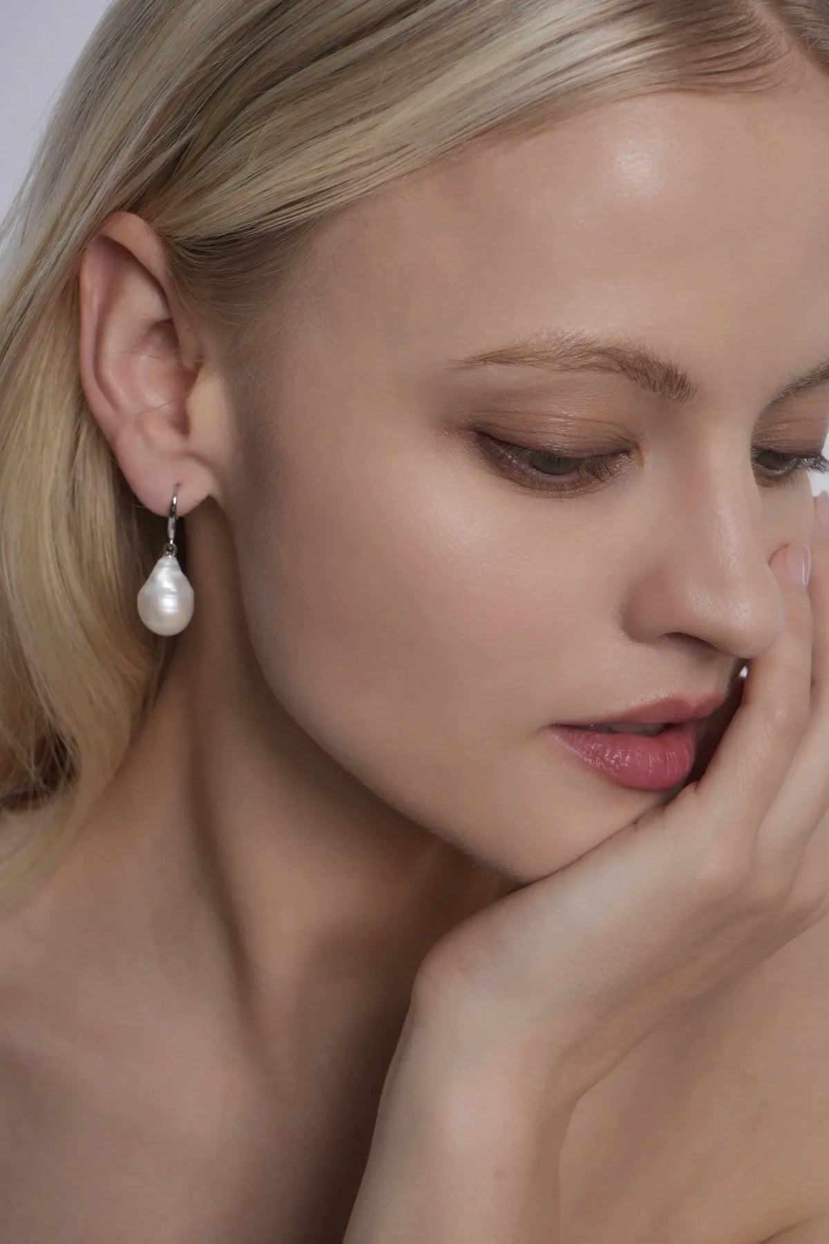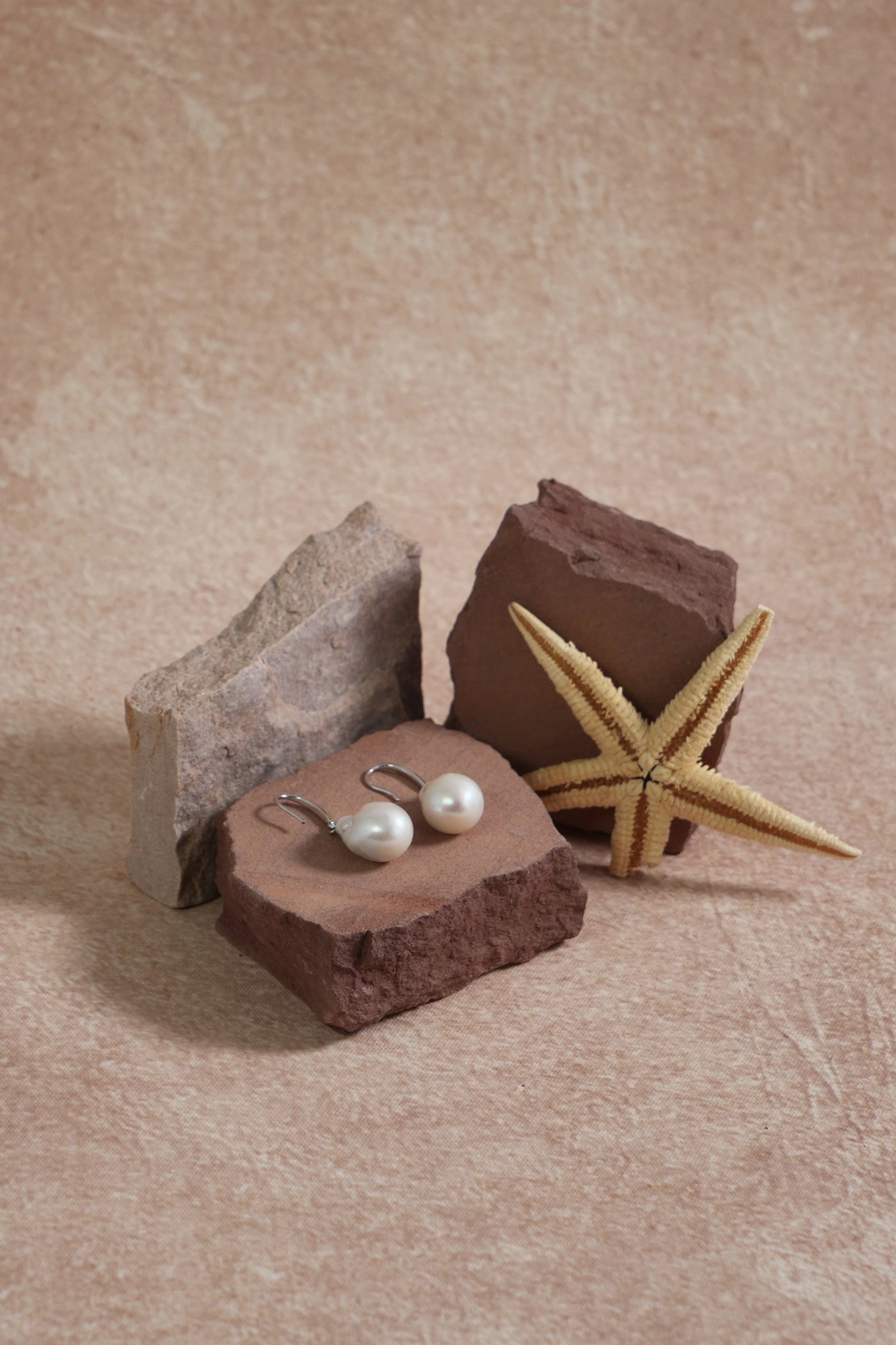 Each earring showcases an irregular freshwater pearl that moves gently with the wearer, reflecting light in delicate, organic curves.