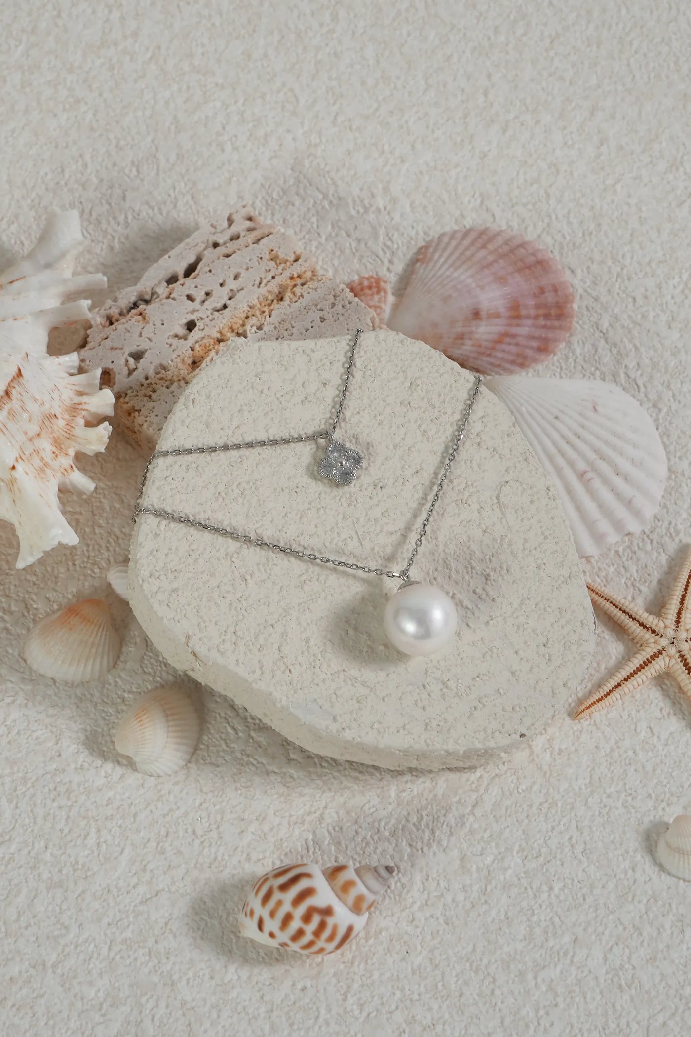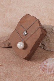 A delicate crystal pendant rests close to the collarbone, while a lustrous 11 mm freshwater pearl gracefully anchors the lower chain — creating balance, rhythm, and light movement with every turn.